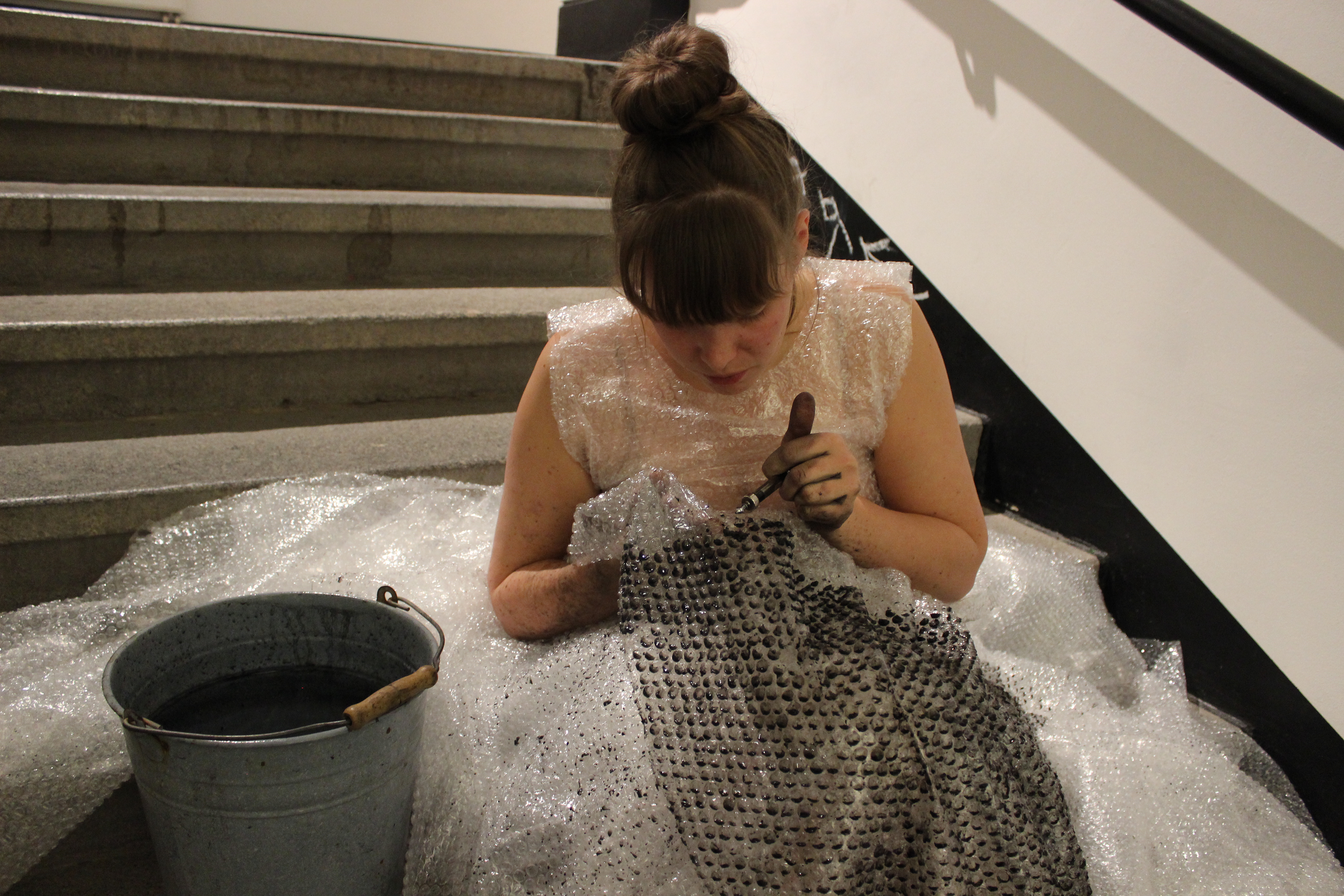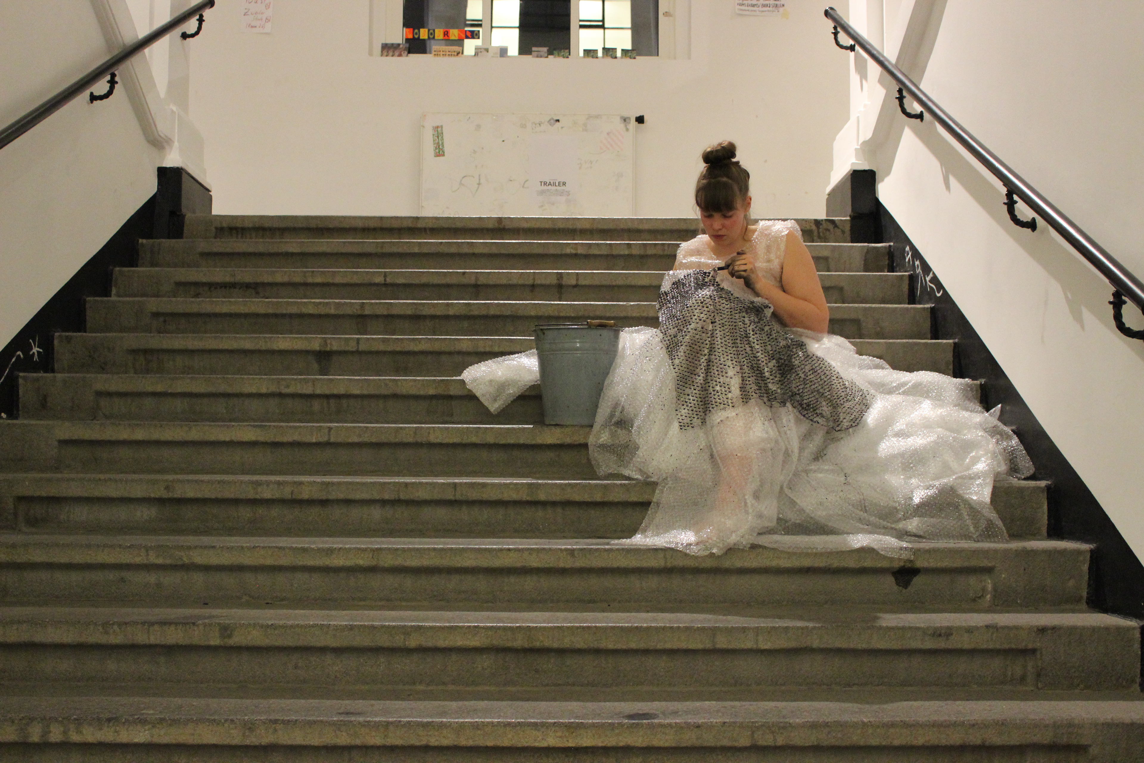 Eine Treppe, auf ihr sitzt eine junge Frau. Diese zieht mit einer Spritze schwarzes Wasser auf und spritzt es in ihr weißes Kleid.